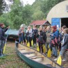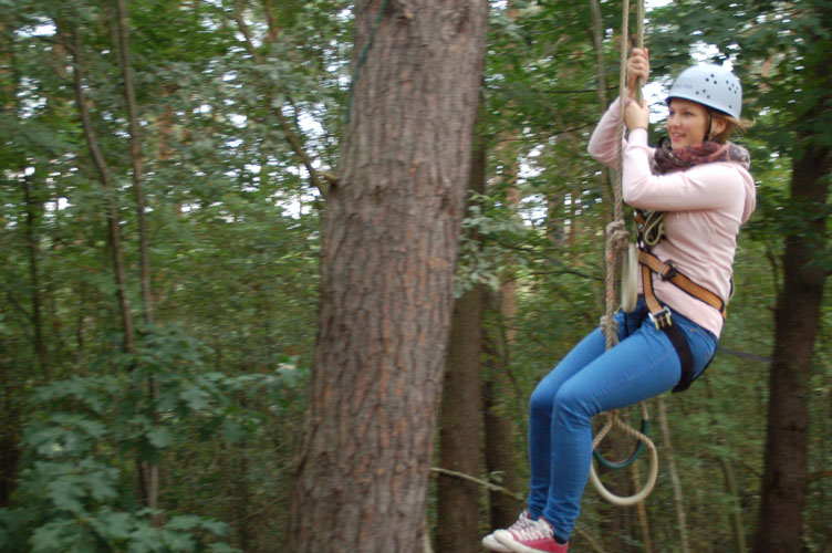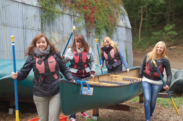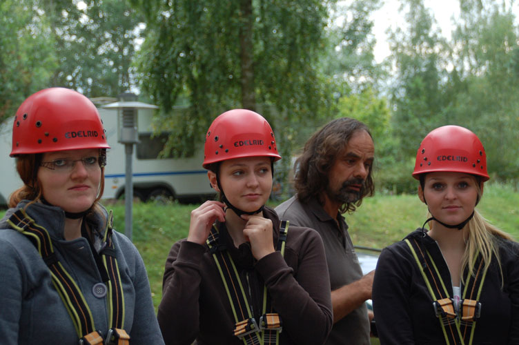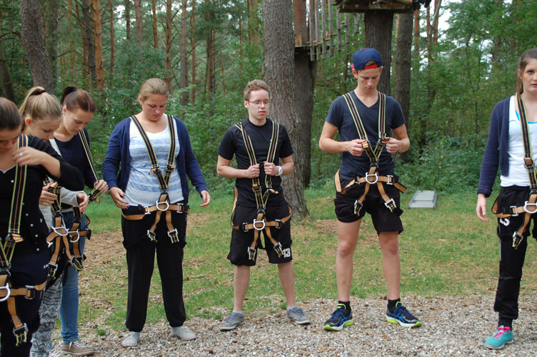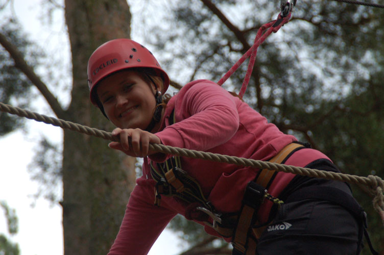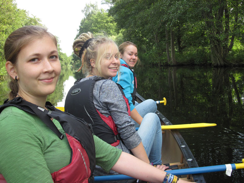 Nach einer sehr späten Rückkehr von Berlin sollte am Donnerstag der zweite Sporttag starten, dieses Mal bei besserem Wetter. Und so trat es ein. Trotz der kurzen Nacht waren alle sehr gut bei der Sache, sei es beim Kanufahren oder beim Klettern auf dem Parcours, wo einige auch den schwersten Grad schafften. Es war bei Sonnenschein möglich, zwei Kanutouren und zwei Perioden im Klettergarten im Wechsel anzubieten. Wer keines der beiden Angebote wahrnehmen konnte, hatte die Gelegenheit, Volleyball oder Fußball zu spielen. Vom Betreuungsteam war für den Abend ein Grillen vorbereitet worden, das sehr ansprechend war, es gab gegrillte Sachen, Antipasti, Salate u.a. Man konnte sogar draußen sitzen. Nach einigen Diskussionen schaffte das Team es noch, dass eine Gruppe von uns bis 22 Uhr vor der Studiobühne eine Musikanlage aufbauen und etwas tanzen konnten.