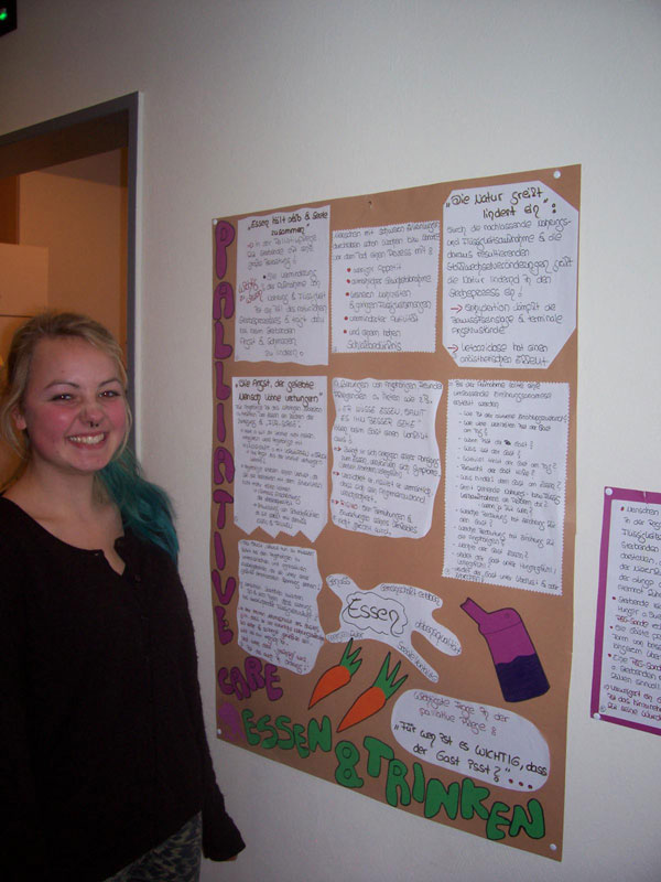 Wir lernten, dass die Gäste hier möglichst genauso leben sollen, wie sie zuvor zu Hause gelebt haben. Außerdem wird im Hospiz Leiden lindernde Arbeit und Palliativpflege durchgeführt, um die Lebensqualität der Gäste zu steigern. Zu Beginn des Einzuges eines Gastes wird deshalb ein Biographiebogen angelegt, d.h. es wird zum Beispiel notiert, wie der Gast schläft (auf welcher Seite oder auf dem Rücken oder Bauch), welche Ess- und Trinkgewohnheiten er hat, welche Lebensgewohnheiten er hat und wie spät er morgens geweckt werden möchte. Dieser Bogen soll bewirken, dass die Gewohnheiten des Gastes weiterhin beibehalten werden können.