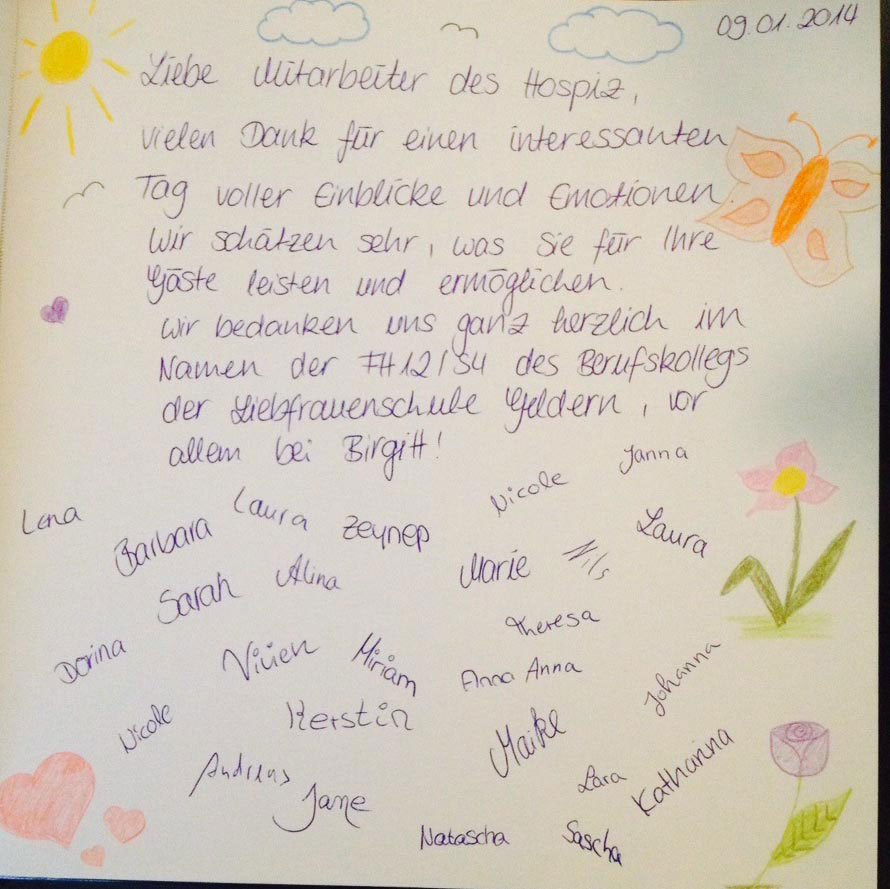 Vor einigen Wochen beschäftigten wir uns im Religionsunterricht in Form eines Referates mit dem Thema „Was ist die ambulante Hospizbewegung, was ist ein Hospiz und was ist eine Palliativstation?“. Da uns nach einer theoretischen Auseinandersetzung mit der Geschichte der Hospizarbeit und deren Aufgaben und Zielen ein praktischer Einblick ermöglicht werden sollte, organisierten wir mit unserer Arbeitsgruppe, zu der neben mir Lena, Miriam und Zeynep gehörten, für den 09.01.2014 einen Besuch im stationären Hospiz in Wetten.
