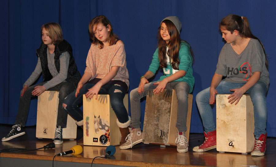 Begeistert aufgenommen wurden im ersten Teil aber auch die Schülerinnen der Percussion-Gruppe der Jahrgangsstufe 6 der Liebfrauenrealschule, die keinen Hauch von Lampenfieber zeigten und mit ihren Cajóns bei zwei Beiträgen rhythmisch klar den Takt in der nahezu bis auf den letzten Platz gefüllten Aula vorgaben.