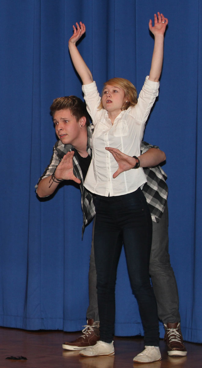Zu lachen gab es auch eine ganze Menge – und das nicht nur bei den Tanzacts, die von einem Zwergen- über einen Schwarzlichttanz bis hin zu einem Modern Dance von Corinna Köters und Ulla Terkatz reichten. Richtig spannend wurde es beim Improvisationstheater, bei dem auf Zuruf aus dem Publikum fünf Abiturienten (Elisa Bröhr, Sarah Könner, Anna Völlings, Nico Nefian, Andreas Notz) einen Ort, einen Gegenstand und einen situativen Rahmen in eine Spontanszene kleiden mussten. Das Publikum war da nicht zimperlich. „Krankenhaus“, „Rollator“ und „Erotik“ hießen beispielsweise drei Begriffe, und ohne dass es platt wirkte, setzten die Schüler auch diese drei Wörter in Sekundenschnelle mit einer gehörigen Portion Situationskomik, mit viel Augenzwinkern und einem hintersinnigem Witz um. Weite Teile des Publikums kugelten sich da vor Lachen.