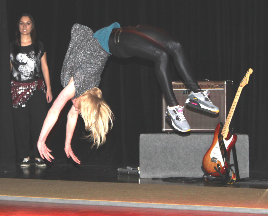 Schwungvoll ging es nach der Pause weiter – und das im wahrsten Sinne des Wortes. Lupenreine Flickflacks integrierte Elena Wagner in ihre Turn- und Tanzperformance, bei der sie von Maren Bald und Dylan Chwallek unterstützt wurde. Mit jedem ihrer Überschläge ging ein Raunen durch die Reihen.