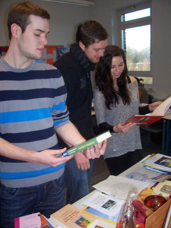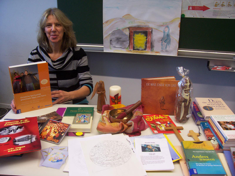 Aber auch der Umgang mit Sterben und Tod spielt in ihrer Arbeit eine Rolle. Zu diesem Thema nannte sie uns ein Beispiel aus ihrer Arbeit. Einer der Bewohner war plötzlich verstorben und hinterließ seine Mitbewohner in einer Art Schock. Besonders Fragen wie „Wo ist er denn jetzt?“ waren zu dieser Zeit ein Thema. Als Seelsorgerin habe sie dann die Aufgabe, mit dem Team zu überlegen, wie solche Situationen gemeinsam gestaltet werden können. „Was brauchen die Mitbewohner mit einer geistigen Behinderung in dieser Zeit? Ist zum Beispiel eine Gesprächsrunde hier der richtige Weg?“, diese Fragen gelte es zu beantworten, so Frau Kalscheur. Man selber müsse es dann immer wieder auch schaffen, mit der eigenen Betroffenheit und Traurigkeit umgehen zu können und für sich klären, wie man es auffangen kann, wenn Bewohner weinen und fragen, ob sie jetzt auch sterben müssen. „Auf diese Rolle muss und kann man sich vorbereiten. Besonders hilfreich ist hierfür eine solche Ausbildung, wie ich sie machen konnte. Dort lernt man alleine schon die Strukturierung solcher Prozesse“, so Frau Kalscheur. In einem Themenblock dieser Ausbildung ging es schwerpunktmäßig um das Thema Trauerarbeit, zu der zwingend die persönliche Auseinandersetzung mit dem Thema Sterben und Tod gehörte.