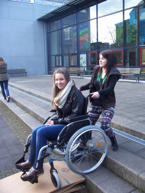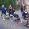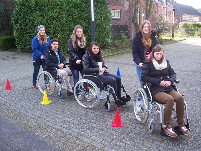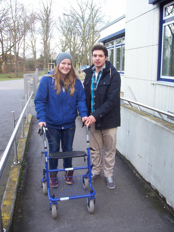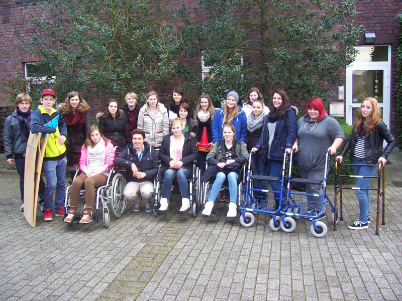 Erstmalig fand das Üben mit den von unserem Kooperationspartner Sanitätshaus Kessels freundlicherweise zur Verfügung gestellten Rollstühlen und Rollatoren schon zu einem früheren Zeitpunkt des Schuljahres statt, da diesmal nicht erst das Praktikum die oben genannten Kompetenzen erfordern sollte, sondern eine erbetene – im Sinne des sozialen Lernens und des sozialen Engagements auch aus schulpastoraler Perspektive sehr willkommene – „Nachbarschaftshilfe“.
