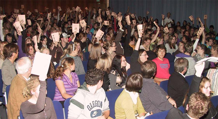 Beim Thema Studiengebühren mussten besonders Pofalla und Friedhoff einigen Gegenwind aus dem Publikum hinnehmen. „Ich konnte auch mit Darlehen studieren und das Geld fließt schließlich in die Hochschulen“, erklärte Pofalla seine Zustimmung zu Studiengebühren. Friedhoff forderte zuerst einen gebührenfreien Kindergartenbesuch und dann Entlastungen für Studenten. Jöbkes, Hendricks und Gonder beurteilen sie hingegen als ungerecht und schädlich. Hendricks: „Der Anteil derer, die studieren können, es aber nicht machen, ist nach Einführung der Studiengebühren bundesweit gestiegen.“