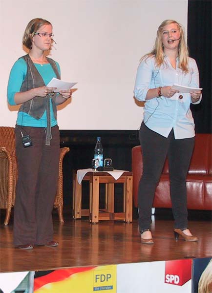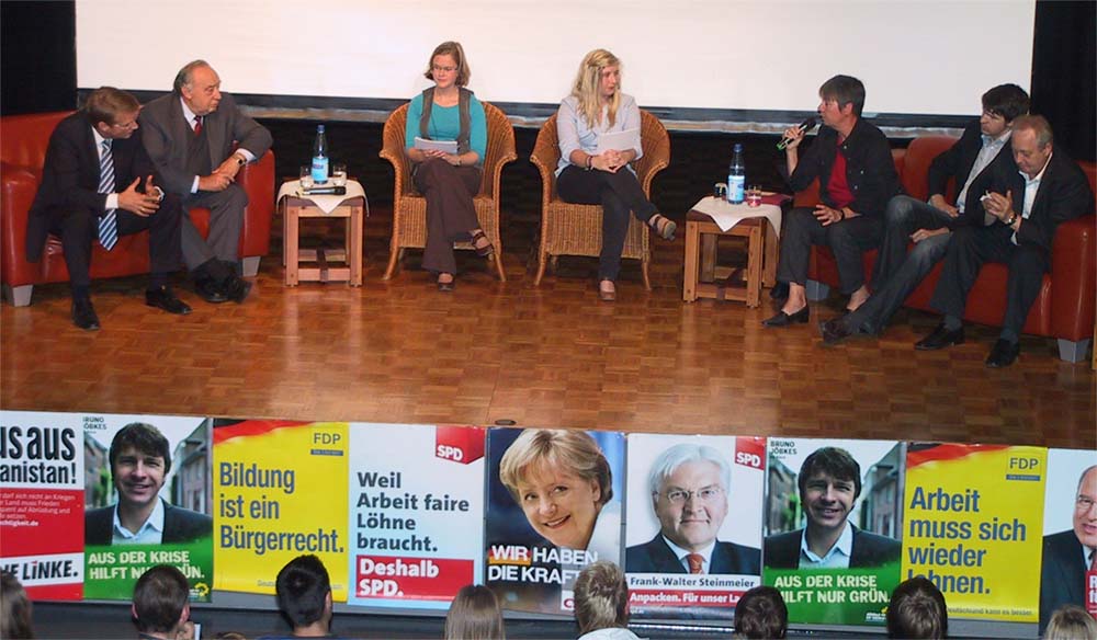 Das ewige „Wer mit wem nach der Bundestagswahl“, das seit Monaten durch die Medien geistert, wurde hier mit keinem Satz gewürdigt. Es ging um Inhalte, den Kreis Kleve und vor allem um die Zukunftsängste der Schüler und Schülerinnen der Liebfrauenschule, Berufskolleg des Bistums Münster. Die ganz großen Themen hatte sich das Vorbereitungsteam rund um die beiden Moderatorinnen Maria Dziobek und Katrin Terkatz aus der AH 13 S1 zur 11. Podiumsdiskussion „Wer die Wahl hat…“ ausgesucht: Staatsverschuldung, Arbeitsplätze, Wahlversprechen, Abwrackprämie und Bildungspolitik. Und wieder einmal waren Teilnehmer da, die sich sehen lassen konnten. Die Spitzenpolitiker des Kreises Kleve waren der Einladung gefolgt und diskutierten am Freitagmorgen meistens kontrovers, manchmal überraschend einig und ab und zu auch mal abseits der Parteilinie.
