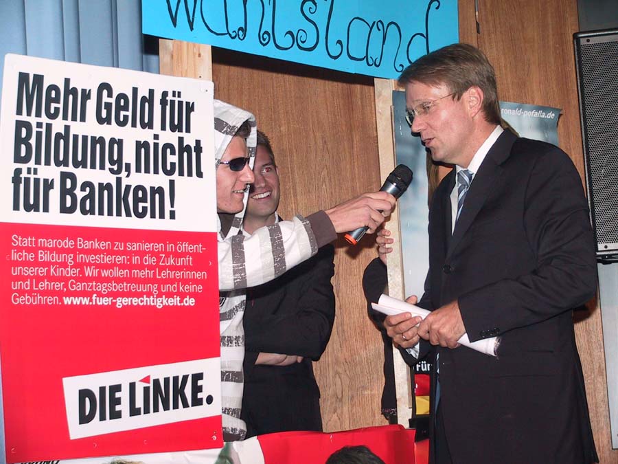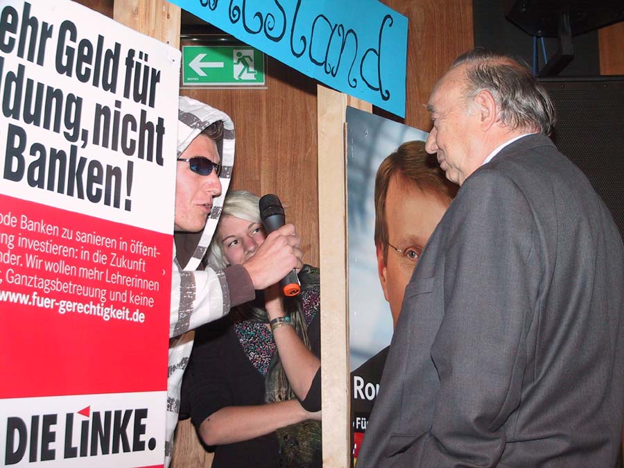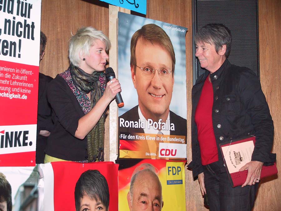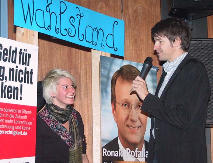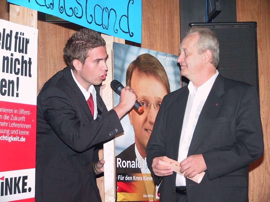 Zuerst mussten sich jedoch die Politiker im Straßenwahlkampf behaupten. So erfuhr man, dass sich Dr. Barbara Hendricks (SPD) gegen den Lehrerberuf entschieden hat, der Bundestagsabgeordnete, Unternehmer und Landwirt Paul Friedhoff (FDP) „gut organisiert“ ist, der gelernte Finanzkaufmann Axel Gonder (Die Linke) von Geldanlagen an der Börse abrät, Bruno Jöbkes (Die Grünen) in seiner Schlachterei ökologisch schlachtet und dass aus dem ehemaligen Hauptschüler Ronald Pofalla, (CDU) „doch noch was geworden ist“.