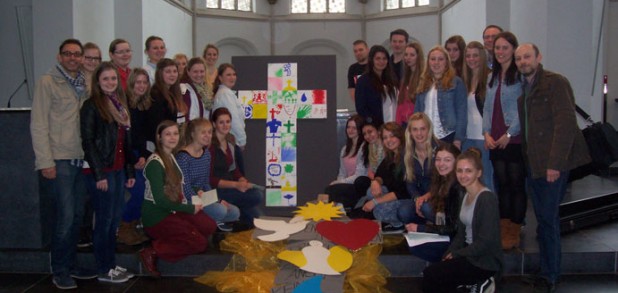 Zusammen mit Frau Kolbecher, Herrn Mäteling und Herrn Dr. Schmitz hat die FH 12S4 den diesjährigen Jugendkreuzweg vorbereitet. Er stand unter dem Motto: „Am Kreuz hängt nicht nur einer, am Kreuz hängen viele..“ und sollte darauf aufmerksam machen, dass jeder solche Kreuz-Situationen kennt, Momente, die ihn bedrücken, runterziehen, in denen man Leid und Not erlebt, aber auch Solidarität, Hilfe und Zuspruch. In 5 Stationen wurden mit Texten und Rollenspielen alltägliche Situationen dargestellt und mit dem Kreuz in Verbindung gebracht.