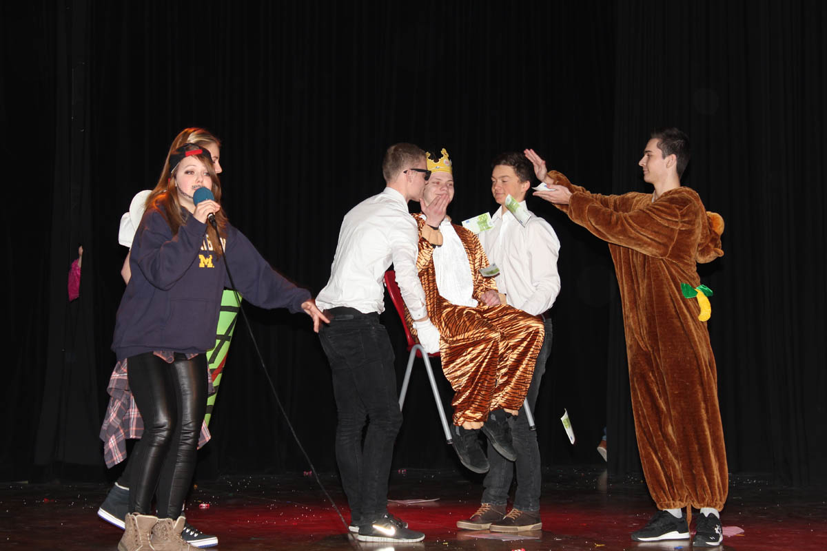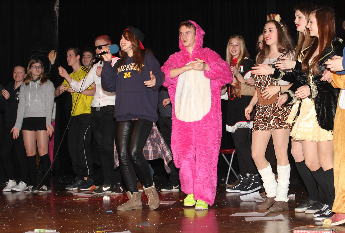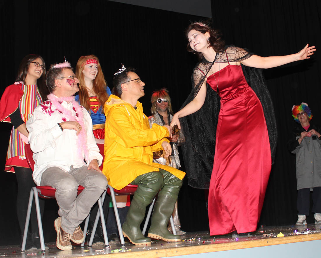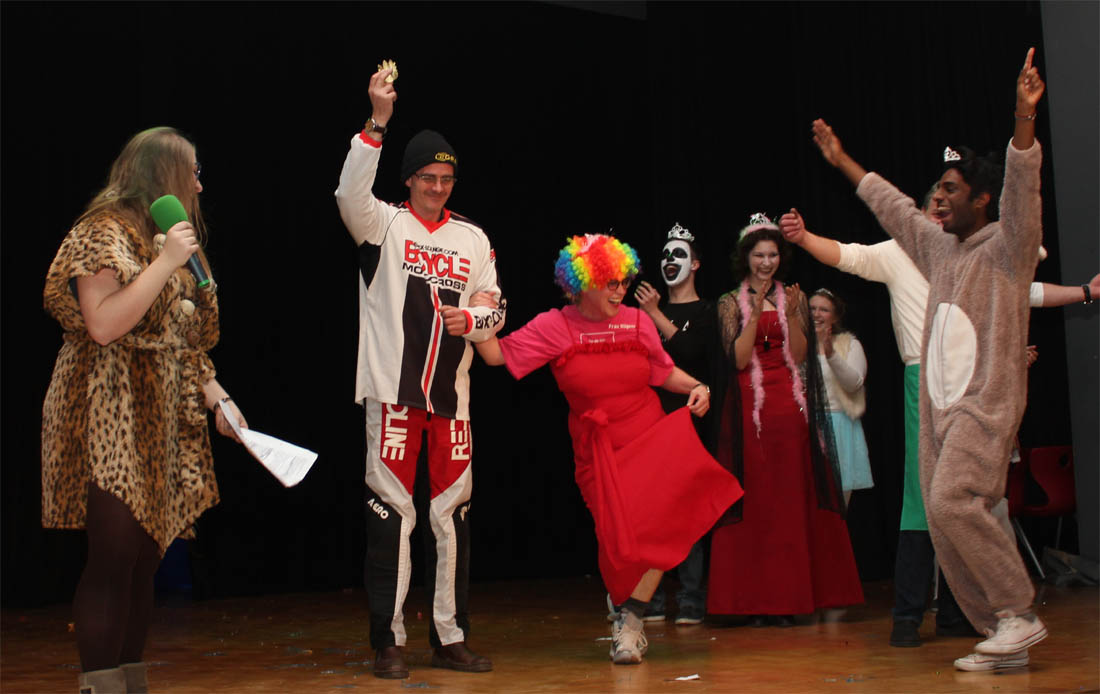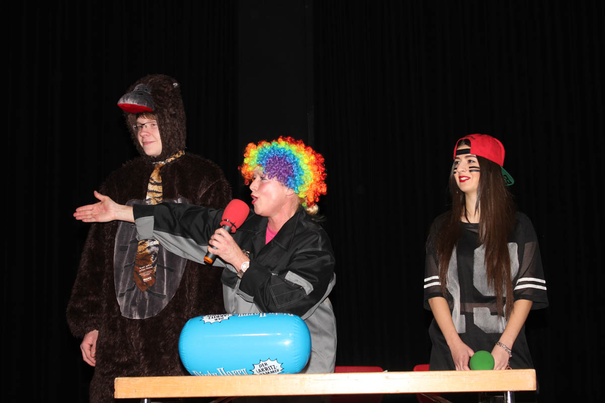 Nhroorrch – war er es wirklich? Der Bauch war da, das Herren-Täschchen auch, und selbst die Püllecken Doornkaat fehlten nicht. Dennoch: Es war nur ein Double von Horst Schlämmer, das gemeinsam mit seiner „Schnecke“ Schantall durch das bunte Programm der Altweiberfeier führte. Roderic Zaak aus der AH/12S2 und Laura Slodczyk aus der FH/12S2 waren in die Rollen geschlüpft – und auch an ihnen lag es, dass die Sause in der Aula, organisiert von der SV mit den Verbindungslehrern Frau Unger und Frau Hügens, mal wieder ein voller Erfolg wurde.