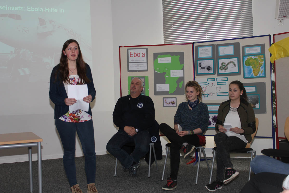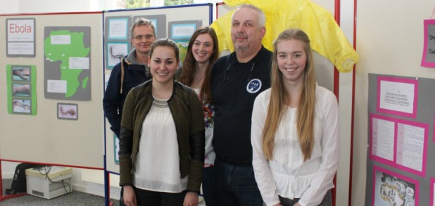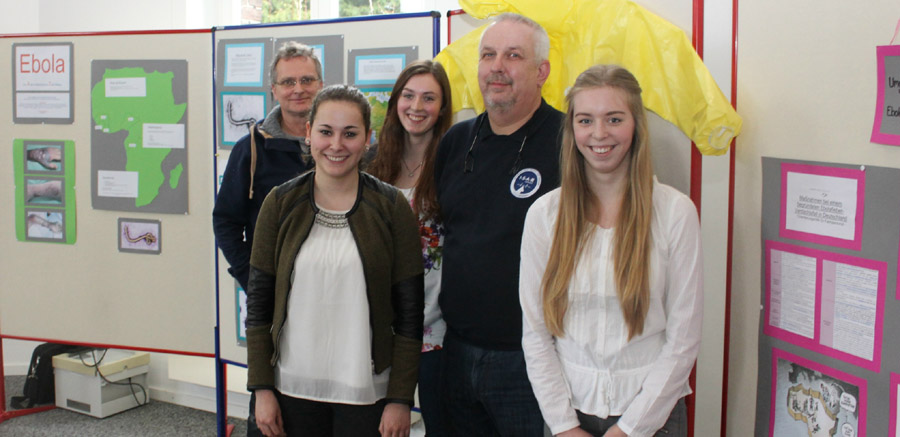 Viel Lob hatte er auch für die Schüler des Grundkurses Gesundheitswissenschaft, die in den vergangenen Wochen eine umfangreiche Ausstellung zum Thema Ebola vorbereitet hatten und dabei nicht nur medizinische Aspekte in den Blick genommen hatten, sondern vor allem auch soziale. Dass sich vieles im alltäglichen Leben der Menschen in Westafrika aufgrund der Seuche geändert habe, verdeutlichte Thomas Laackmann insbesondere beim sonst dort üblichen Umgang mit Verstorbenen. „Es gab dort Menschen, die ihre hoch infektiösen Toten versteckt haben, nur damit diese nicht in eigens errichteten Krematorien verbrannt werden, was ursprünglich ein absolutes Tabu gewesen sei.“