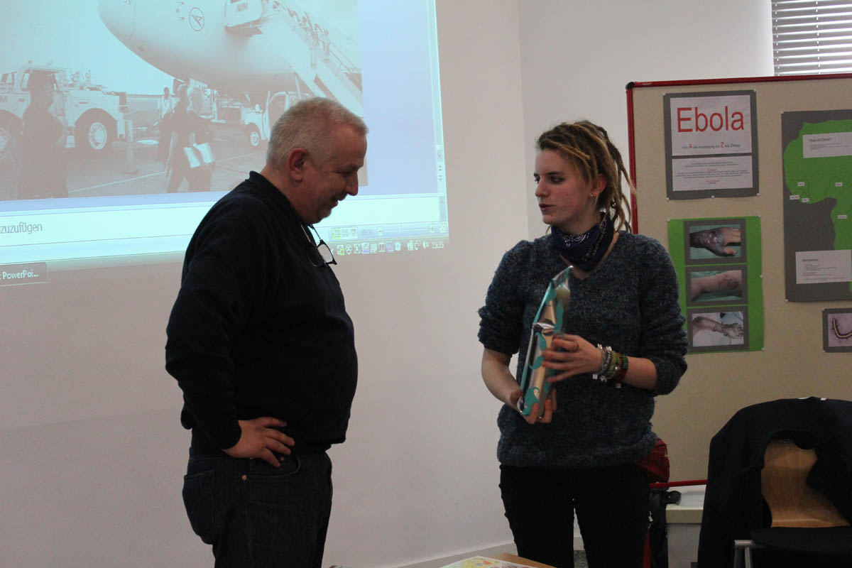 Viele Fragen richteten die Schüler an Thomas Laackmann, und viele drehten sich um seine persönlichen Eindrücke und Empfindungen. „Was waren Ihre Gedanken beim Hin- und was beim Rückflug?“ lautete eine. Beim Hinflug, so die Antwort, habe man sich natürlich gefragt, was einen konkret in Westafrika erwarte. Schließlich sei es für ihn der erste humanitäre Einsatz in einem von einer hoch infektiösen Seuche betroffenen Land gewesen. Und natürlich habe auf dem Rückflug die große Hoffnung bestanden, nicht angesteckt worden zu sein. Erschreckend, aber andererseits auch nicht verwunderlich seine Aussage hierzu: Liberia sei ein Land, in dem vieles käuflich sei, so auch der kurze Medizincheck vor der Ausreise. Für Geld, so seine Hypothese, könne man sich wohl auch eine Ausreise trotz eines medizinischen Verdachts erkaufen.